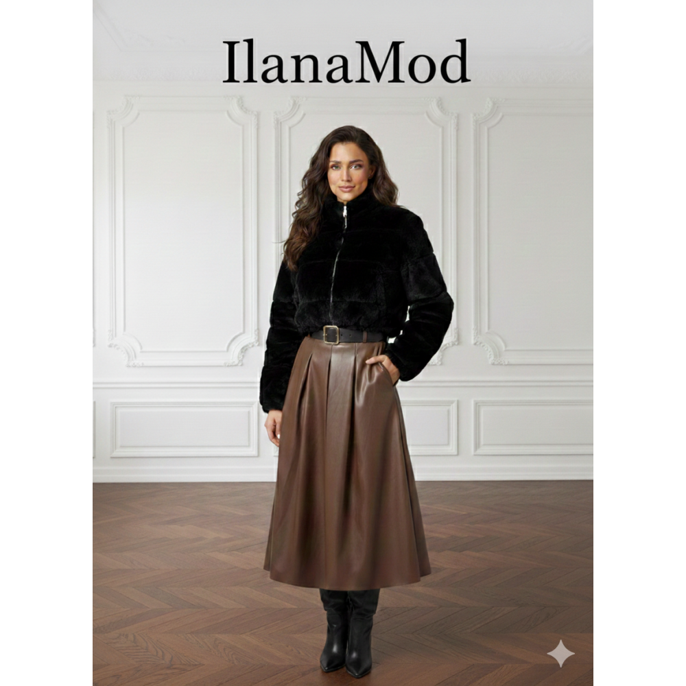 Apportez une touche de caractère et d'élégance à votre garde-robe avec notre jupe en simili-cuir marron. Sa coupe évasée et sa finition subtilement satinée en font la pièce maîtresse idéale pour un look moderne, affirmé et résolument féminin.