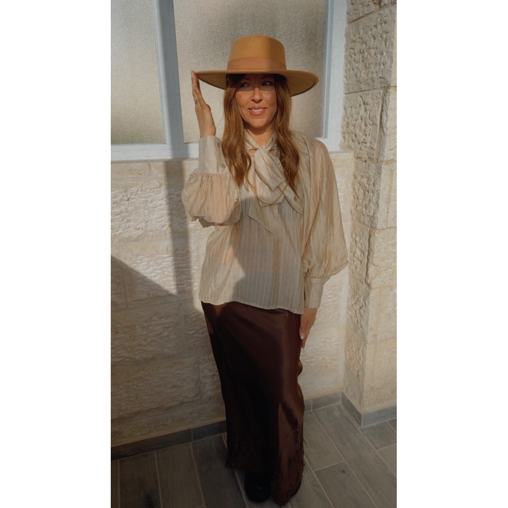 • Design à Rayures : De fines rayures marron sur un fond beige lumineux qui allongent la silhouette et apportent une touche de modernité classique.